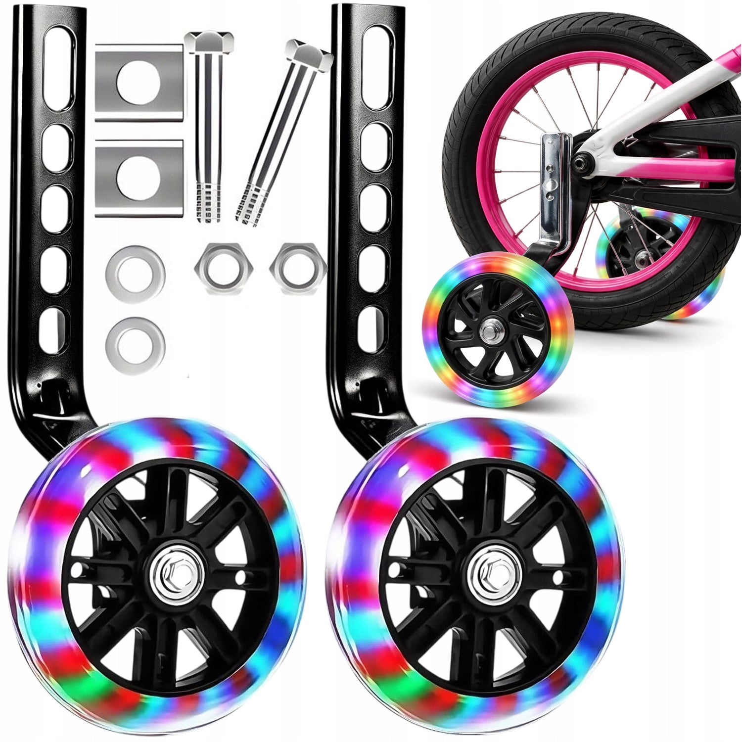 LED-Stützräder für Kinderfahrräder 12–20 Zoll – Kontai® sind die ideale Unterstützung für Kinder, die das Fahrradfahren lernen oder zusätzliche Stabilität benötigen. Die integrierten LED-Lichter leuchten automatisch während der Fahrt und erhöhen sowohl die Sicherheit als auch den Spaßfaktor.