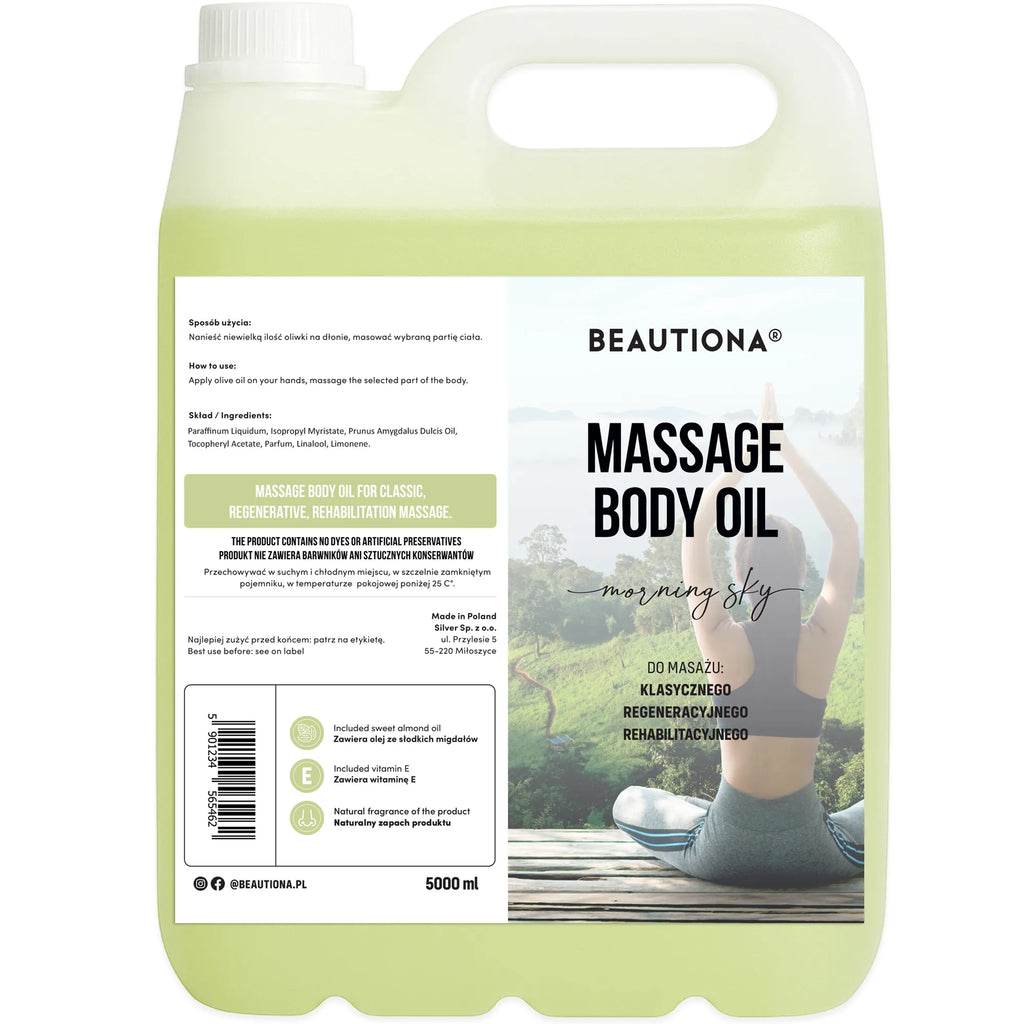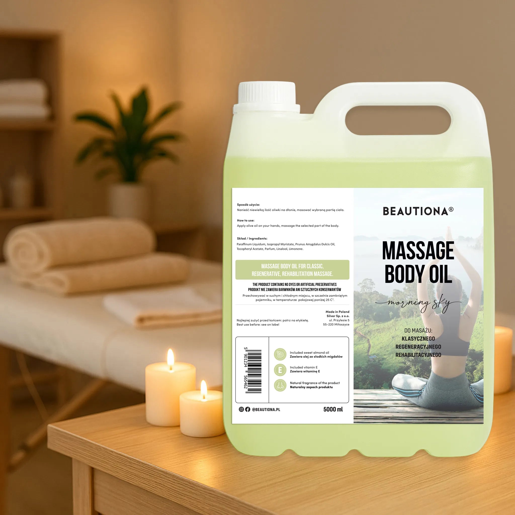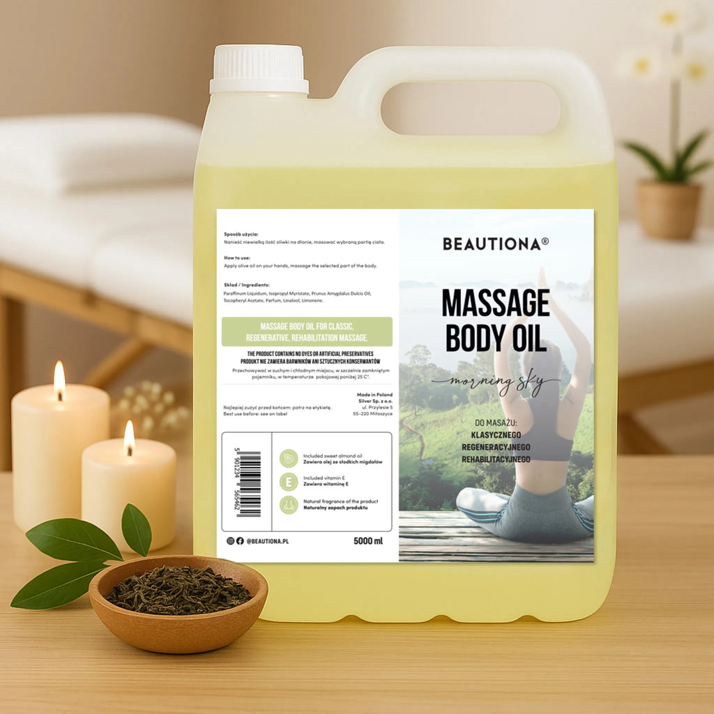 BEAUTIONA Massageöl Morning Sky 5000 ml ist ein professionelles Öl für Ganzkörper-, Gesichts-, Hals- und Dekolletémassagen. Dank des enthaltenen natürlichen Mandelöls spendet es intensive Feuchtigkeit, macht die Haut geschmeidig und verbessert ihre Elastizität. Vitamin E wirkt antioxidativ, schützt vor Hautalterung und beruhigt Reizungen. Die seidige Textur sorgt für optimalen Gleiteffekt, während der frische, leichte Duft Morning Sky die Sinne belebt und für gute Laune sorgt – ideal für Spa, Kosmetikstudio oder den Heimgebrauch.